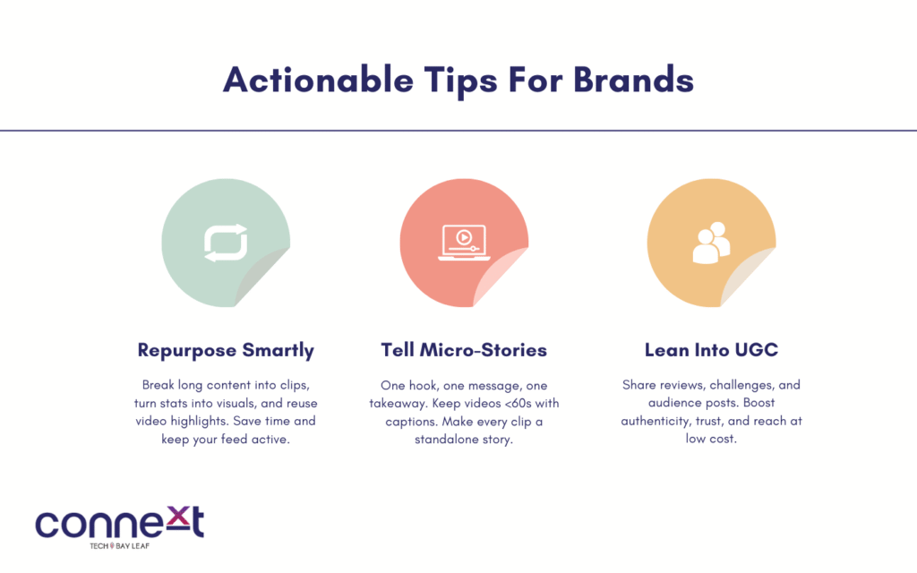 Actionable tips for brands (repurposing, storytelling, UGC)